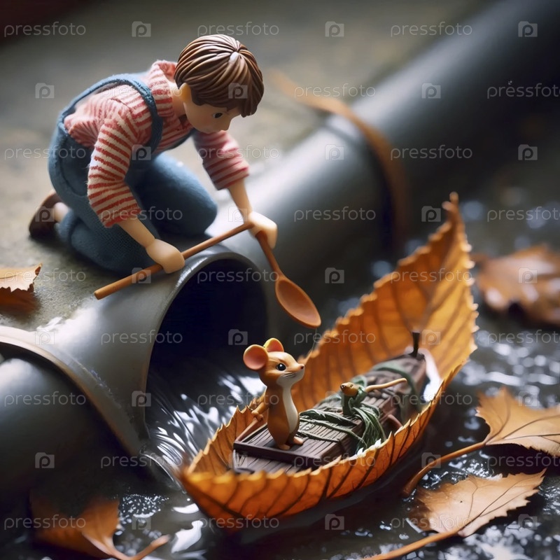 Мальчик, плавающий на лодке из листьев с пассажиром мыши в канаве, Ai generated image