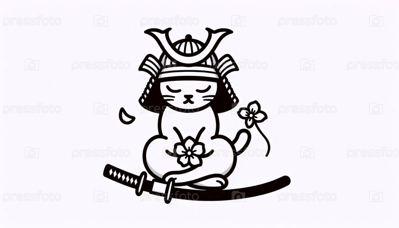 Минималистское линейное искусство медитирующего самурайского кота, Ai generated image