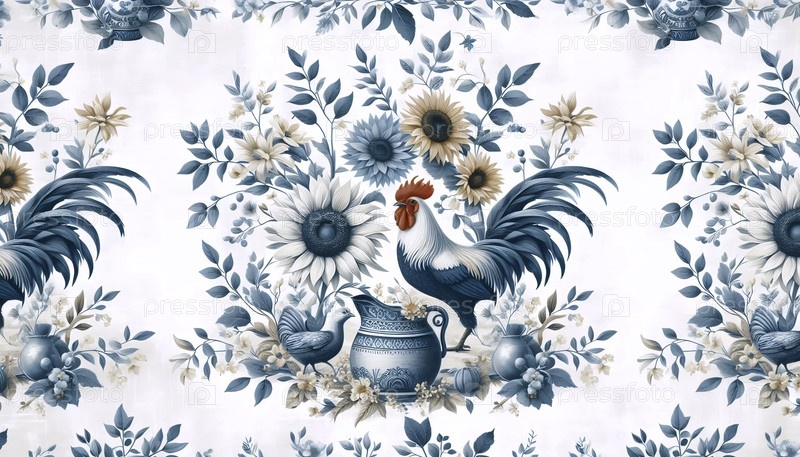 Французская страна с бесшовными узорами в синих и белых цветах, Ai generated image