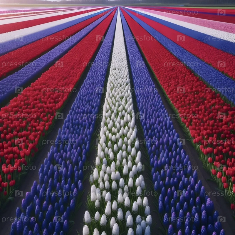 Голландский флаг течет через поля тюльпанов, Ai generated image