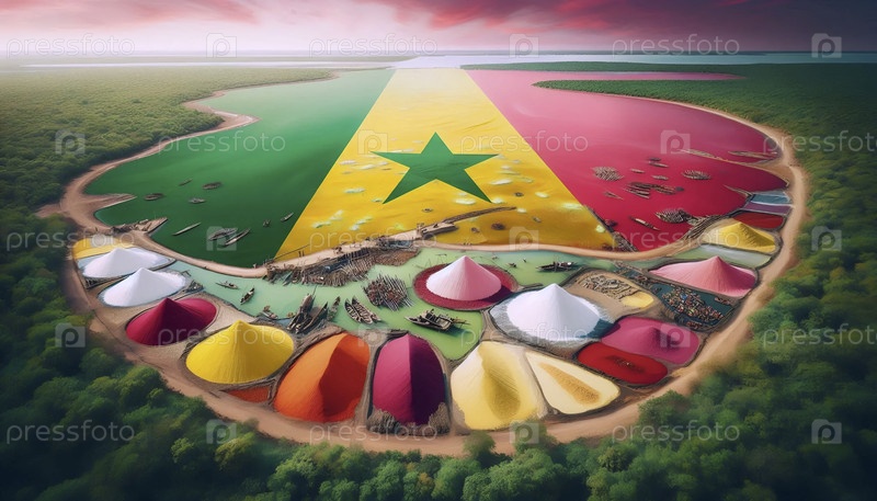 Сенегальский флаг в розовом озере Lac Rose и сбор соли, Ai generated image