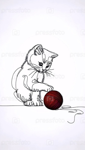 Минималистское линейное искусство котёнка и шариков из пряжи, Ai generated image