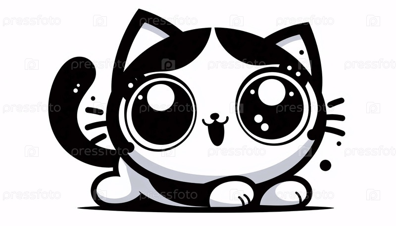 Черно-белая иллюстрация кота кавайи, Ai generated image