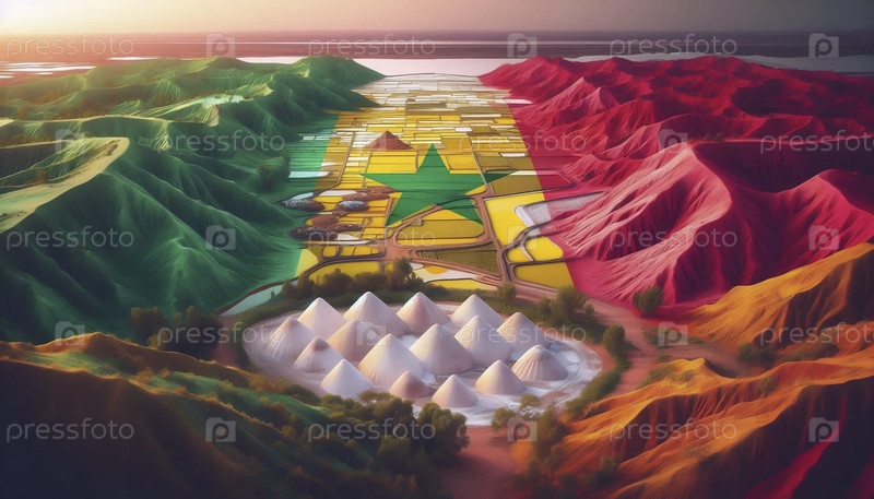 Сенегальский флаг в розовом озере Lac Rose и сбор соли, Ai generated image