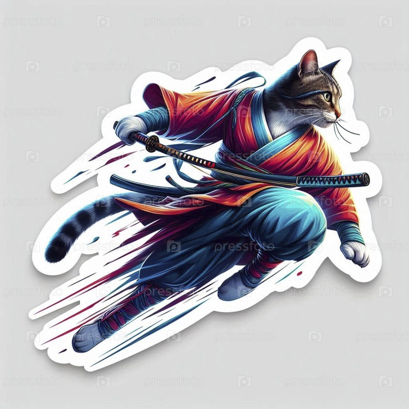 Акционный снимок самурайского кота Наклейка в середине прыжка, Ai generated image