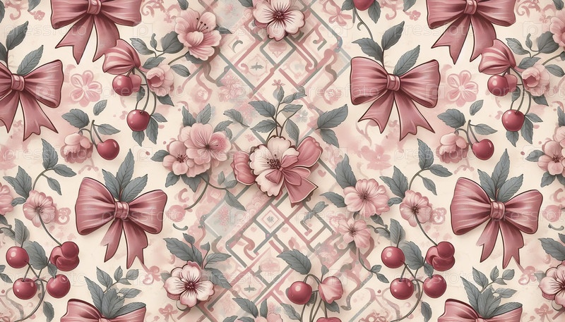 Vintage Coquette Cherry pattern pink bow Chinoiserie retro girly shabby chic, Ai создал изображение