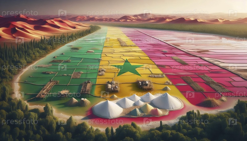 Сенегальский флаг в розовом озере Lac Rose и сбор соли, Ai generated image