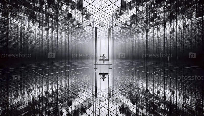 Ребенок качается в гигантском зеркальном лабиринте, Ai generated image