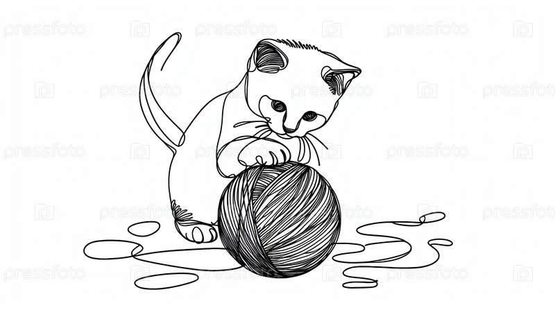 Минималистское линейное искусство котёнка и шариков из пряжи, Ai generated image