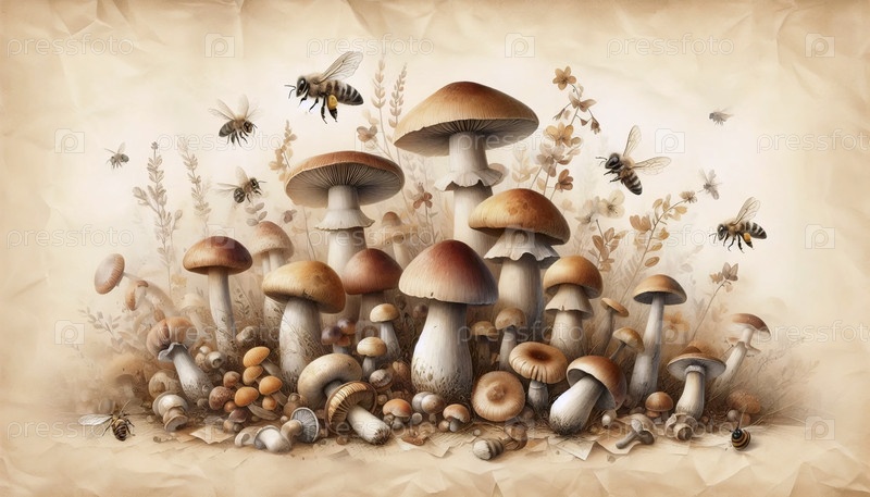 иллюстрация пчел и грибов