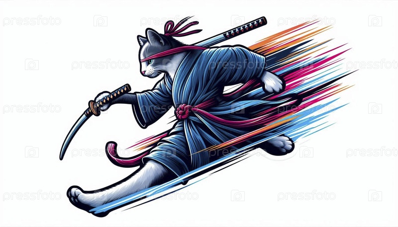 Акционный снимок самурайского кота Наклейка в середине прыжка, Ai generated image