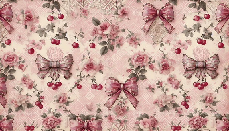 Vintage Coquette Cherry pattern pink bow Chinoiserie retro girly shabby chic, Ai создал изображение