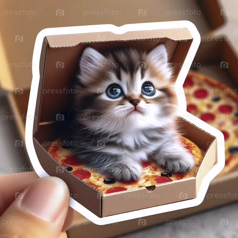Милый котёнок, сидящий в наклейке для коробки с пиццей, Ai generated image