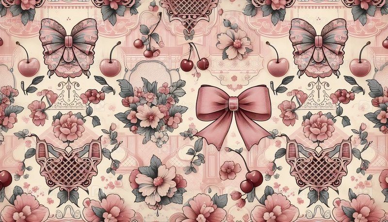 Vintage Coquette Cherry pattern pink bow Chinoiserie retro girly shabby chic, Ai создал изображение