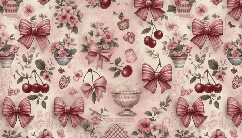 Vintage Coquette Cherry pattern pink bow Chinoiserie retro girly shabby chic, Ai создал изображение