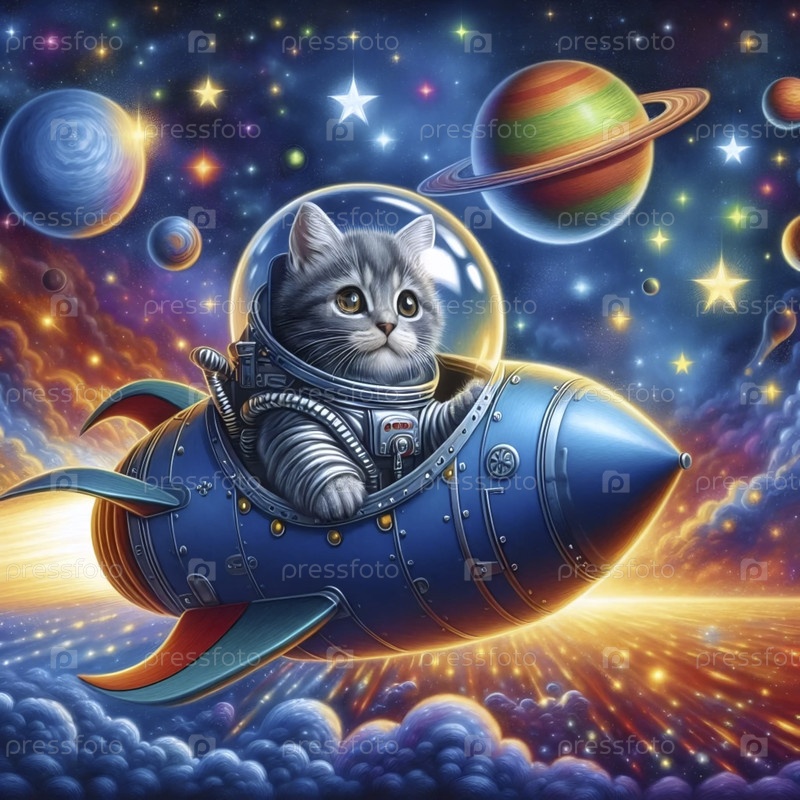 Кошка-астронавт в ракетном космическом корабле художественная печать, Ai generated image
