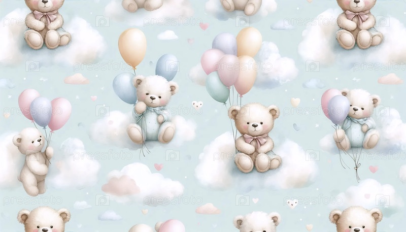 Акварельный плюшевый медведь бесшовный шаблон для детской комнаты, Ai generated image