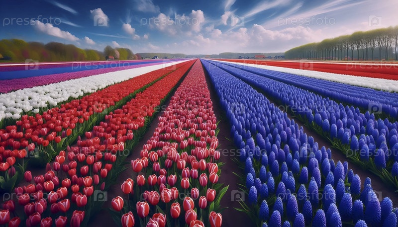 Голландский флаг течет через поля тюльпанов, Ai generated image