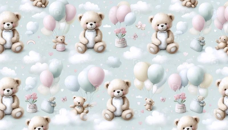 Акварельный плюшевый медведь бесшовный шаблон для детской комнаты, Ai generated image