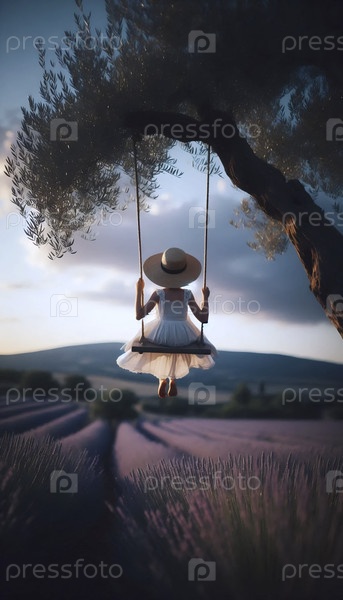 Ребенок, качающийся в солнечном поле лаванды, Ai generated image
