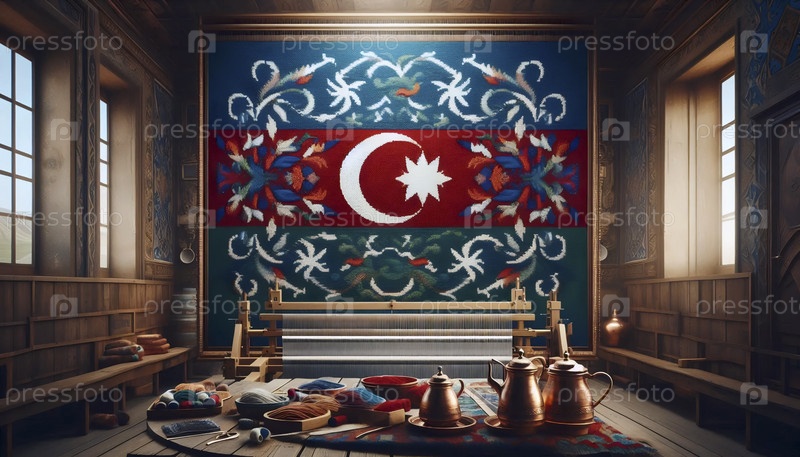 Азербайджанский флаг в традиционном ковроткачестве и чайной, Ai generated image