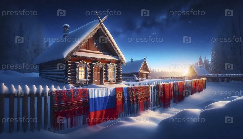 Российский флаг в зимнем лесу и архитектуре, Ai generated image