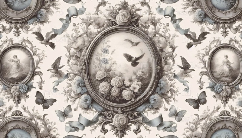 A French Toile de Jouy винтажные камео с цветами птицы бабочек, Ai generated image