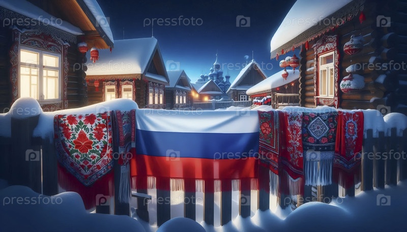 Российский флаг в зимнем лесу и архитектуре, Ai generated image