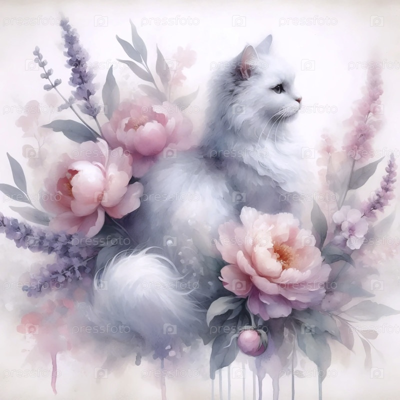Нежный акварельный кот, окруженный цветами, Ai generated image