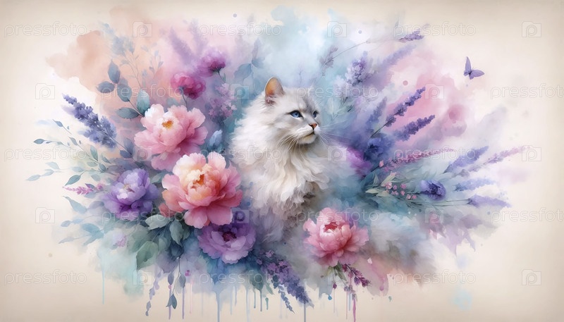 Нежный акварельный кот, окруженный цветами, Ai generated image