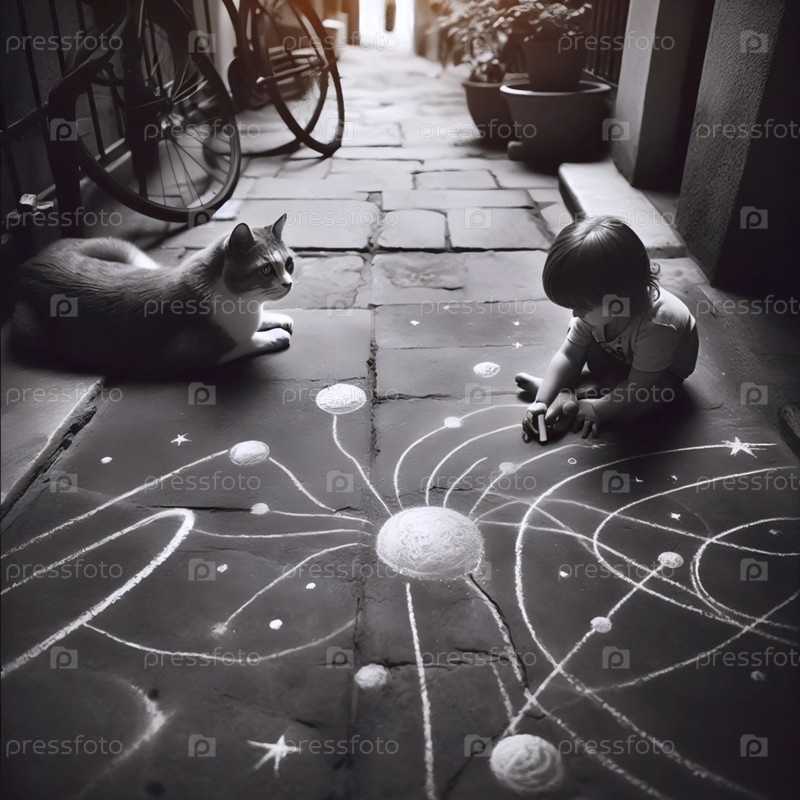 A cat observing a child's earnest sidewalk chalk universe, Ai generated image Кошка наблюдает за ребенком на тротуаре