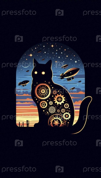 Силуэт стимпанк-коты со светящимися шестернями, Ai generated image