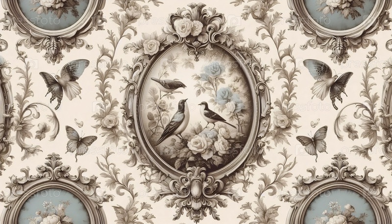 A French Toile de Jouy винтажные камео с цветами птицы бабочек, Ai generated image