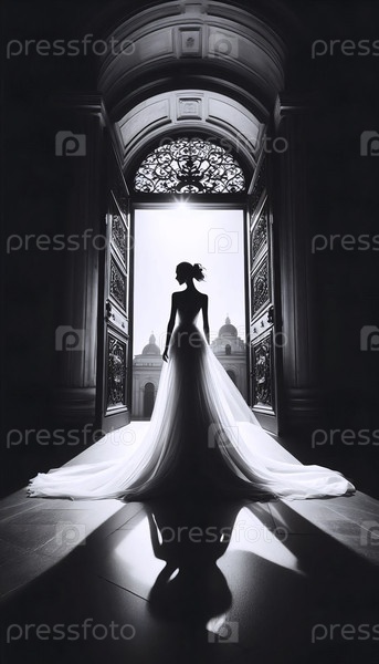 Силуэт невесты с высоким контрастом в дверном проеме, Ai generated image