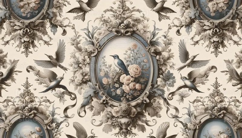 A French Toile de Jouy винтажные камео с цветами птицы бабочек, Ai generated image