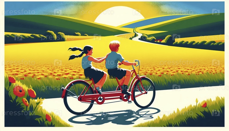 Винтажный туристический плакат для детей на тандемном велосипеде, Ai generated image