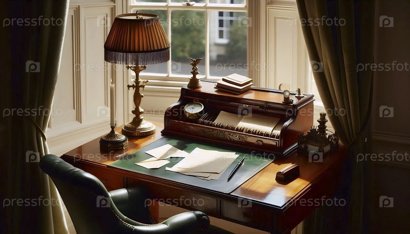 Винтажный рабочий стол в окне залива, Ai generated image