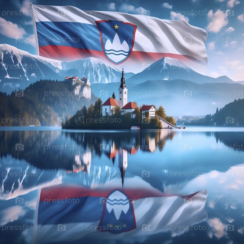 Словенийский флаг в альпийском озере отражение, Ai generated image