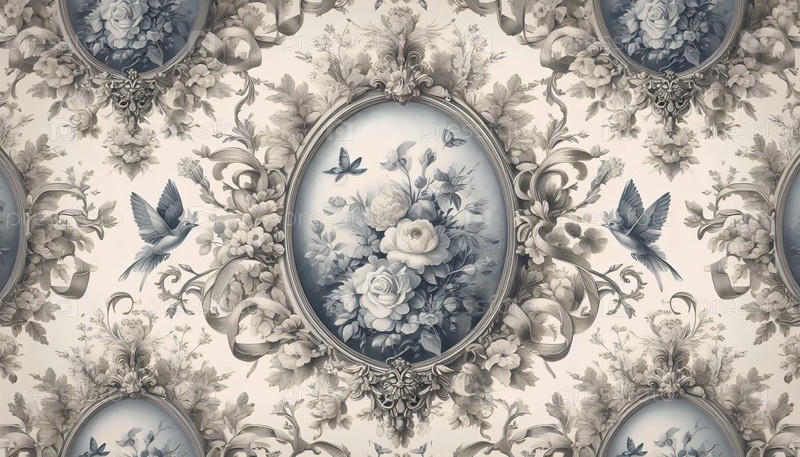 A French Toile de Jouy винтажные камео с цветами птицы бабочек, Ai generated image