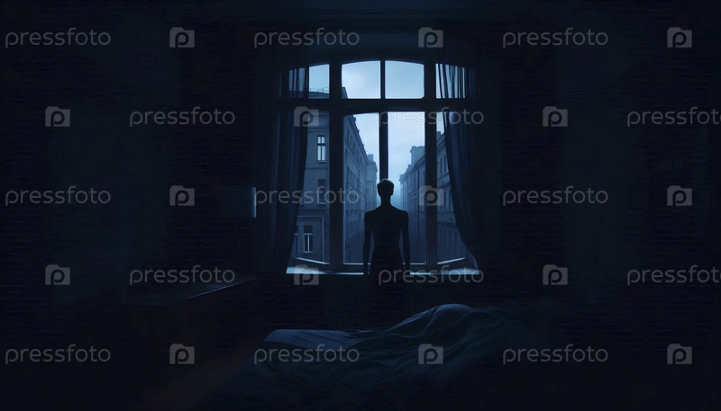 Силуэт в окне на закате, Ai generated image