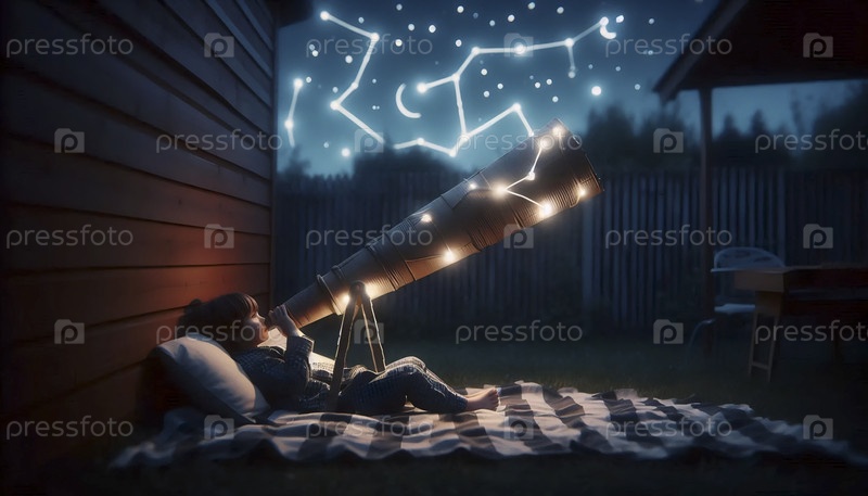 Мальчик смотрит на звезды через гигантский картонный телескоп, Ai generated image