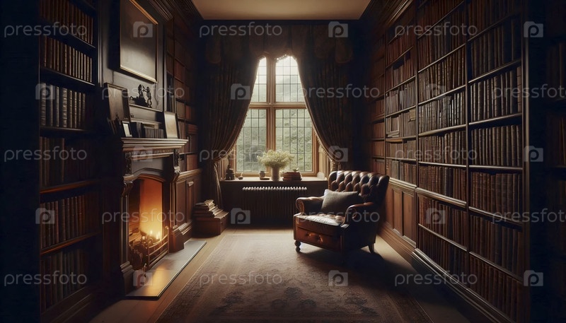 Классический интерьер английской коттеджной библиотеки, Ai generated image