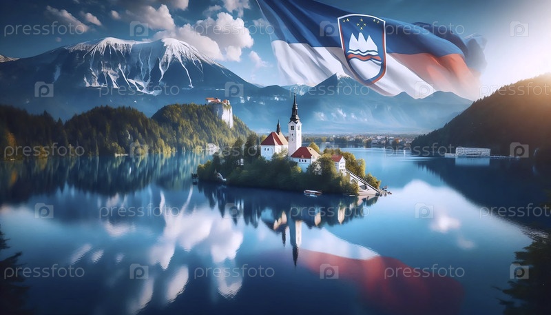 Словенийский флаг в альпийском озере отражение, Ai generated image