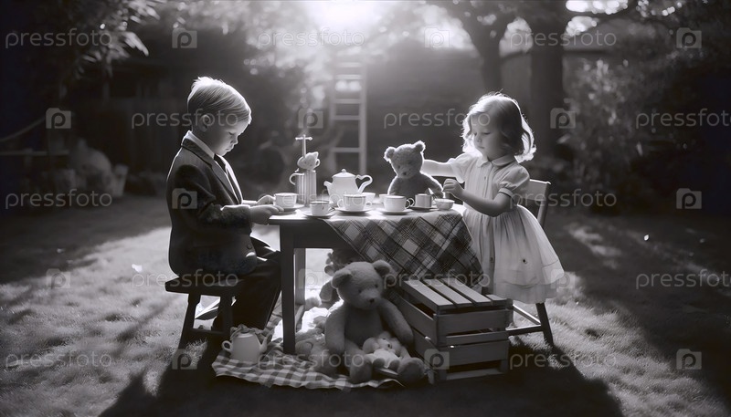 Очаровательный плакат чайной вечеринки с плюшевым медведем на заднем дворе, Ai generated image