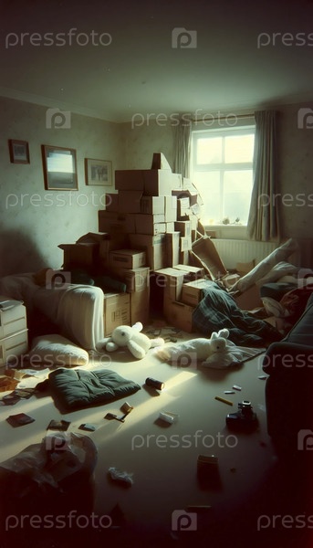 Развалившийся форт одеяла в пустой комнате, Ai generated image