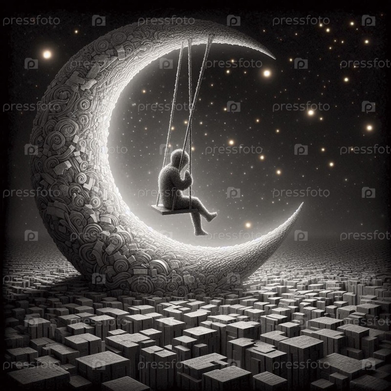 Ребенок, качающийся на полумесяце над городом, Ai generated image