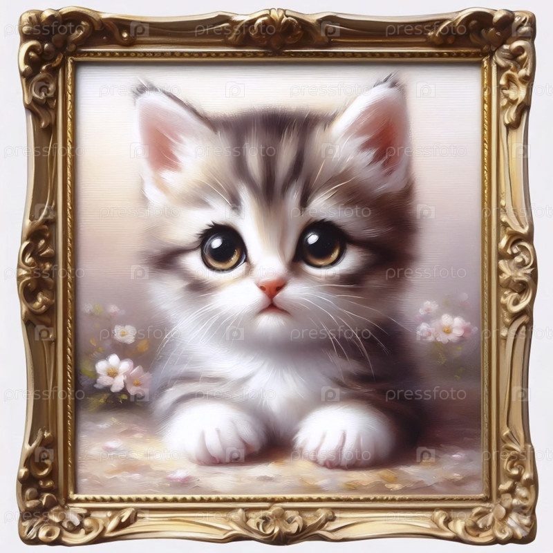 Небольшой портрет кота с золотой рамкой, масляная живопись, Ai generated image