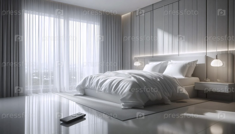 Моторизованный занавес в современной спальне, Ai generated image