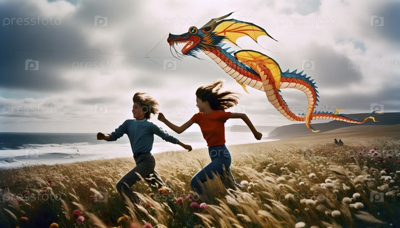Мальчик и девочка запускают яркого драконьего воздушного змея на прибрежном лугу, Ai generated image