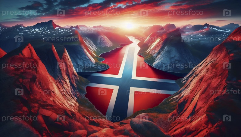 Норвежский флаг в фиорде ландшафтная композиция, Ai generated image